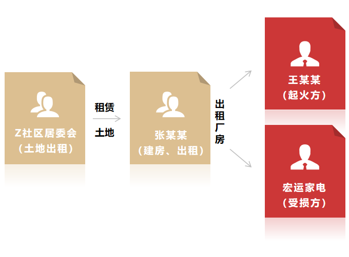 张某某租赁Z居委会土地建设工业园区厂房,并将工业园区内的房屋对外出租。王氏门窗配件加工部业主王某某租赁部分房屋,从事钢衬加工业务。刘某某租赁部分房屋用作宏运家电经销处存放货物。王某某与宏运家电两家房屋相邻,中间有一道两扇的木门。