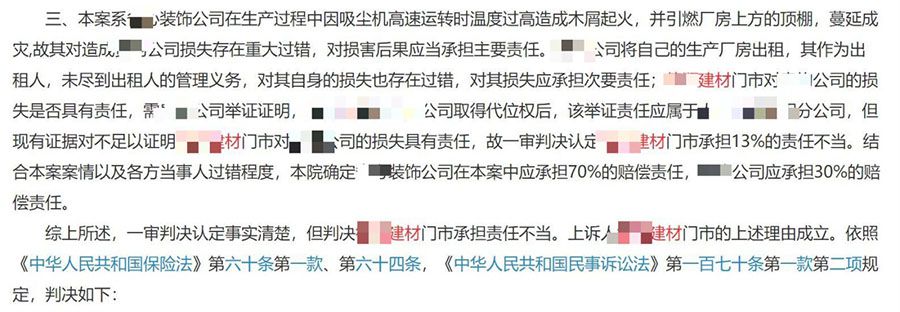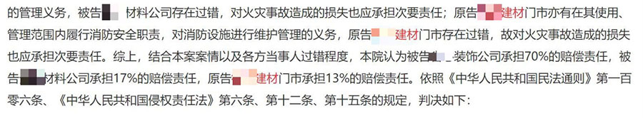 该案经过一审、二审、重审一审、重审二审,法院最终支持我们的观点,判令建材商自担13%的责任无需在另案中对外赔偿,同一场火灾事故中的责任比例应当结合案件实际区别分析。